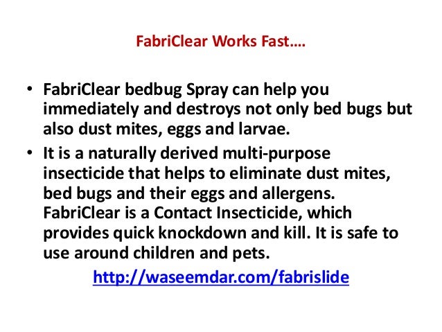 FabriClear is Easy Ready to Use. I was getting bit each night. This product is easy to use and effective and can help you get rid of bedbugs as well as their eggs. Jul 30 2016 - The Fabriclear As Seen on TV is a safe non-toxic spray that kills bed bugs by contact. Get rid of pesky bed bugs and dust mites in your home with a specially formulated spray that kills the bugs and their eggs on contact. FabriClear is the safe non-toxic spray that kills bed bugs by. Get Rid of Bed Bugs.