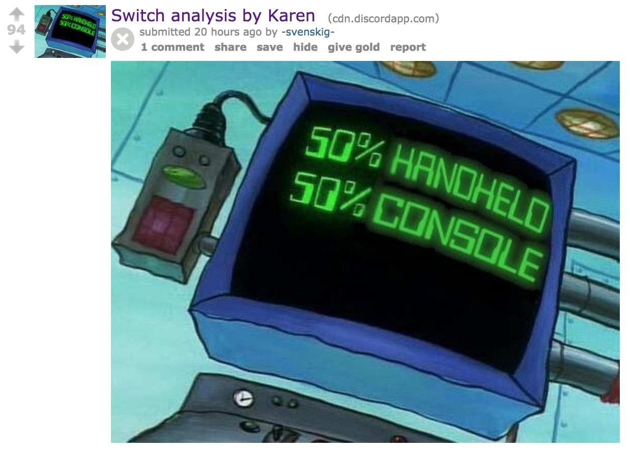 It isnt made by the Nintendo switch mods. Many wonderful things came from Nintendos first look at the Switch in a preview in October 2016 One that nobody expected was the introduction of Switch enthusiast Karen. Memes gifs other NSFW.